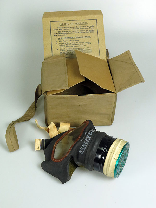 Civilian anti-gas respirator containing a filtration material of blue asbestos and merino wool